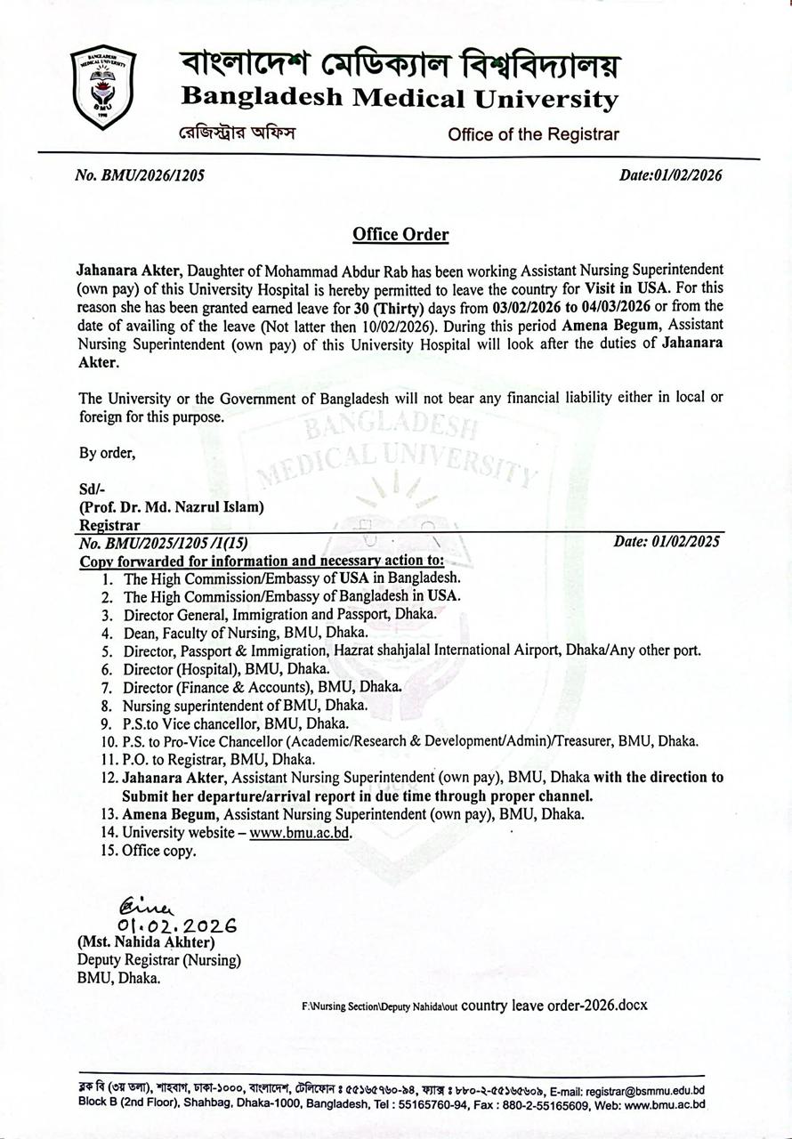| 8 | BMU/2026/1205 | Jahanara Akter , Assistant Nursing Superintendent | Director Hospital (Office) | Download |